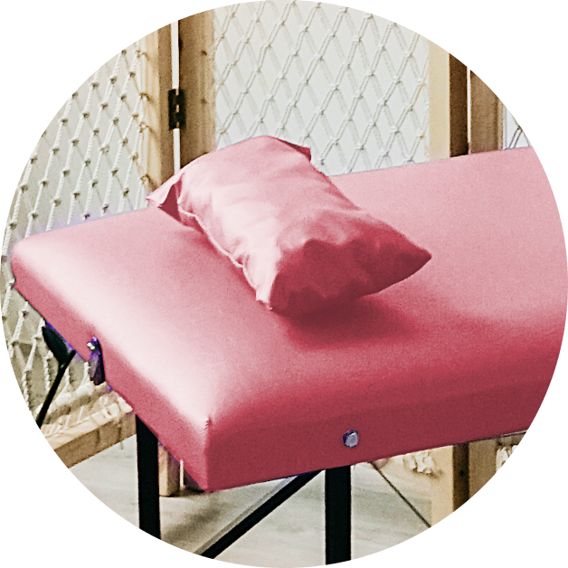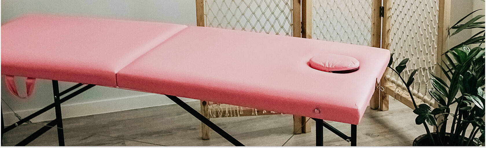Рабочее место мастера: кушетка, стул, этажерка и лампа.